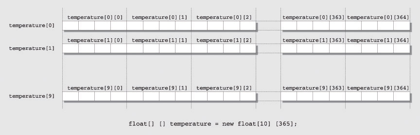 The first statement declares the array variable temperature for two-dimensional arrays of type float. The second statement creates the array with ten elements, each of which is an array of 365 elements.