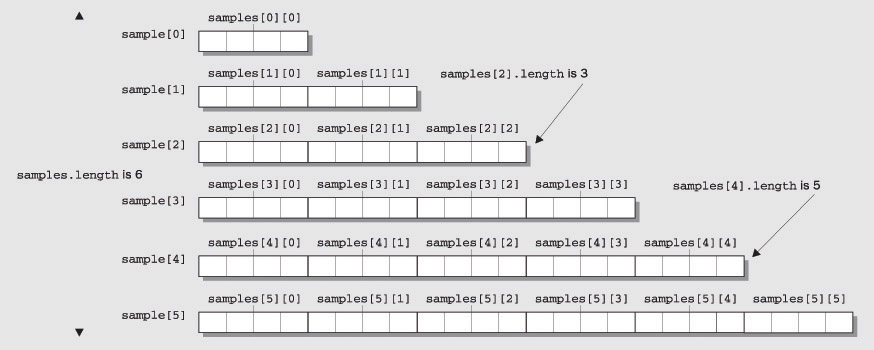 When you create an array of arrays, the arrays in the array do not need to be all the same length. You could declare an array variable samples with the statement: