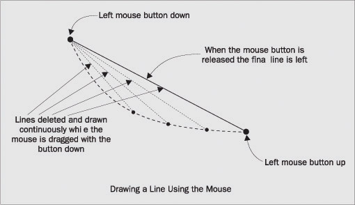 As you drag the mouse with the button down, we'll display the line as it looks at that point. Thus the line will be displayed dynamically all the time the mouse cursor is being dragged and the left button remains pressed. This process is called rubber-banding.