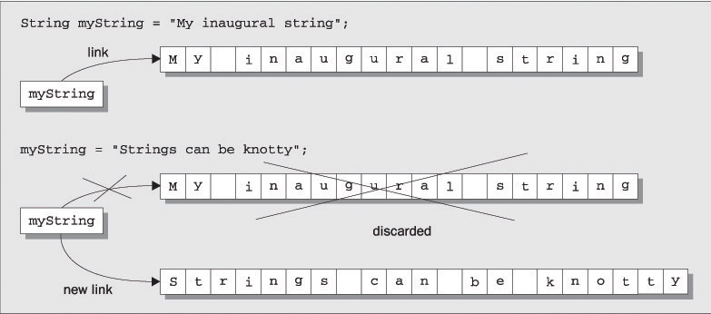 The string itself is distinct from the variable you use to refer to it. In the same way as we saw with array objects, the variable myString stores a reference to a String object, in other words, it keeps track of where the string object is in memory. When we declare and initialize myString, it links to the initializing string value. When we execute the assignment statement, the original link is severed, the old string is discarded, and the variable myString stores a reference to the new string value. This means that you cannot extend the string that is referred to in a variable of type String. String objects are said to be immutable – which just means that they cannot be changed. To change the string referenced by a String variable you throw away the reference to the old string and replace it with a reference to a new one. The distinction between a String variable and the string it references is not apparent most of the time, but we will see situations later in this chapter where it is important to understand this, so keep it in mind.