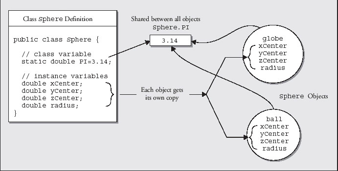 Why would you need two kinds of variables in a class definition? The instance variables are clearly necessary since they are the parameters that distinguish a particular object. The radius and the coordinates of the center of the sphere are fundamental to determining how big a particular Sphere object is, and where it is in space. However, although the variable PI is a fundamental parameter for a sphere - to calculate the volume for example - it would be wasteful to store a value for PI in every object, since it is always the same. Incidentally, it is also available from the standard class Math so it is somewhat superfluous in this case, but you get the general idea. So one use for class variables is to hold constant values such as ( that are common to all objects of the class.