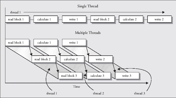 Once a block of data has been read, the computation process can start, and as soon as the computation has been completed, the results can be written out. With the program executing each step in sequence (that is, as a single thread), as shown in the top half of the diagram, the total time for execution will be the sum of the times for each of the individual activities. However, suppose we were able to execute each of the activities independently, as illustrated in the lower half of the diagram. In this case, reading the second block of data can start as soon as the first block has been read, and in theory we can have all three activities executing concurrently. This is possible even though you only have one processor, because the input and output operations are likely to require relatively little processor time while they are executing, so the processor can be doing other things while they are in progress. This can have the effect of reducing the total execution time for the program.