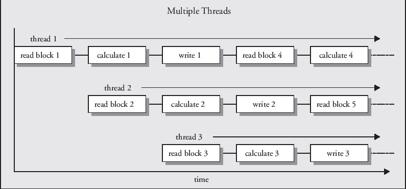 An important consideration when you have a single program running as multiple threads is that the threads are unlikely to have identical execution times, and, if one thread is dependent on another, you can't afford to have one overtaking the other – otherwise you'll have chaos. Before you can start calculating in the example in the diagram, you need to be sure that the data block the calculation uses has been read, and before you can write the output, you need to know that the calculation is complete. This necessitates having some means for the threads to communicate with one another.