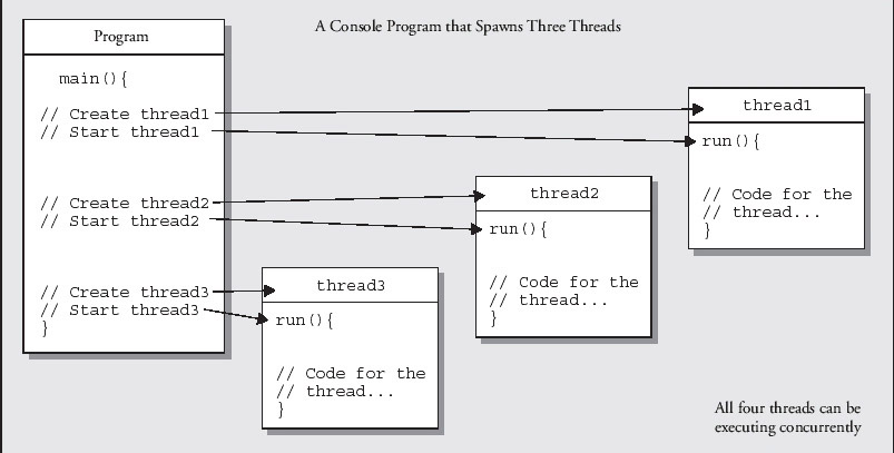 To start the execution of a thread, you call the start() method for the Thread object. The code that executes in a new thread is always a method called run(), which is public, accepts no arguments, and doesn't return a value. Threads other than the main thread in a program always start in the run()method for the object that represents the thread. A program that creates three threads is illustrated diagrammatically here: