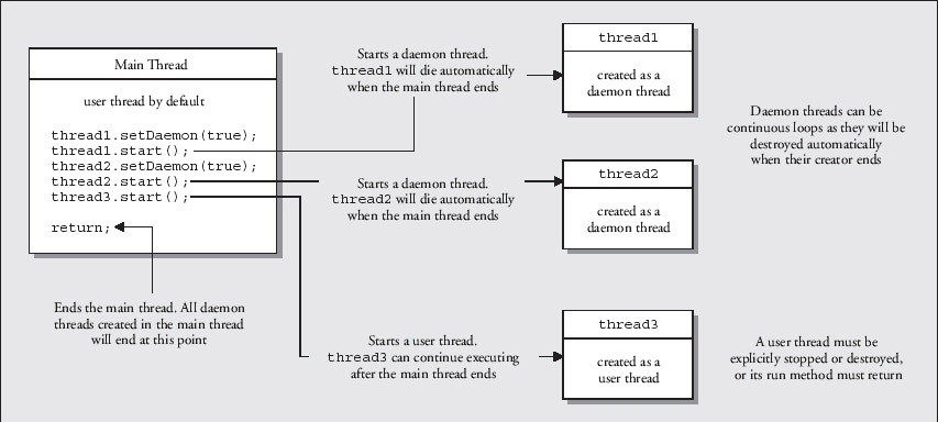 The call to setDaemon(), with the argument true in the TryThread constructor, makes the thread that is created a daemon thread. A daemon thread is simply a background thread that is subordinate to the thread that creates it, so when the thread that created the daemon thread ends, the daemon thread dies with it. In our case, the method main() creates the daemon threads so that when main() returns, all the threads it has created will also end. If you run the example a few times pressing Enter at random, you should see that the daemon threads die after the main() method returns, because, from time to time, you will get some output from one or other thread after the last output from main().
