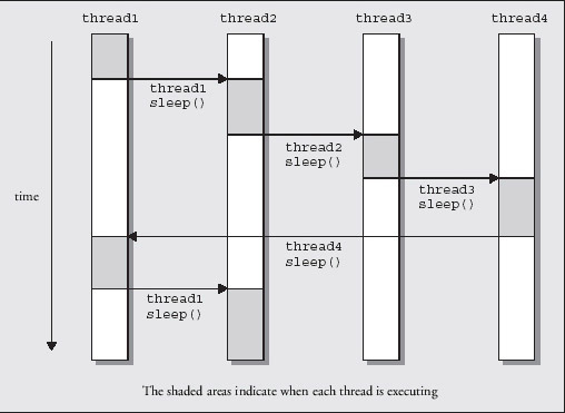 The diagram below illustrates how four threads might share the processor over time by calling the sleep() method to relinquish control.
