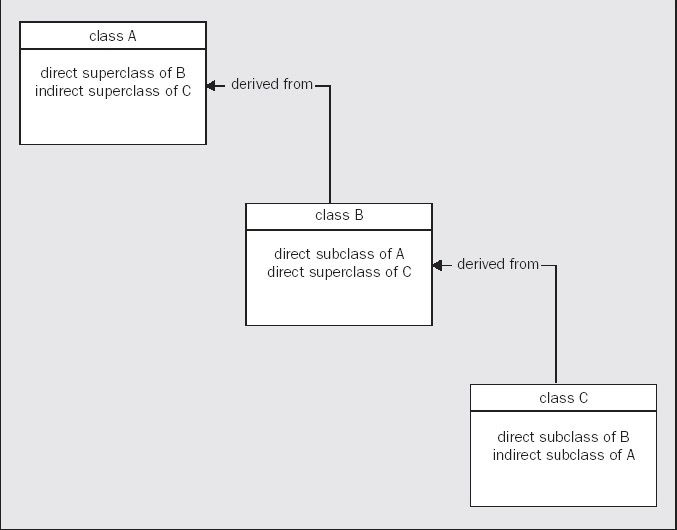 Let's start by understanding the jargon. Defining a new class based on an existing class is called derivation. The new class, or derived class, is referred to as a direct subclass of the class from which it is derived. The original class is called a base class because it forms the base for the definition of the derived class. The original class is also referred to as a superclass of the derived class. You can also derive a new class from a derived class, which in turn was derived from some other derived class, and so on. This is illustrated in the following diagram:
