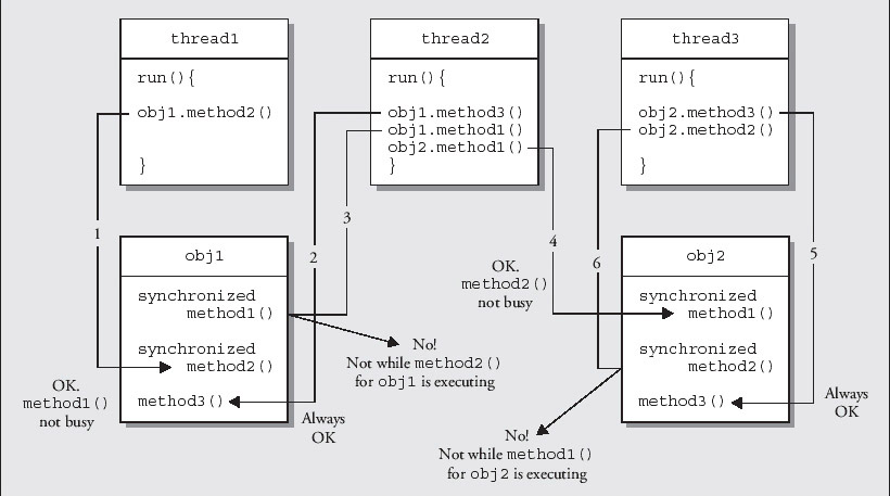 The numbers on the arrows in the diagram indicate the sequence of events. No! indicates that the thread waits until the method is unlocked so it can execute it. While method1() in obj2 is executing, method2() for the same object can't be executed. The synchronization of these two instance methods in an object provides a degree of protection for the object, in that only one synchronized method can mess with the data in the object at any given time.