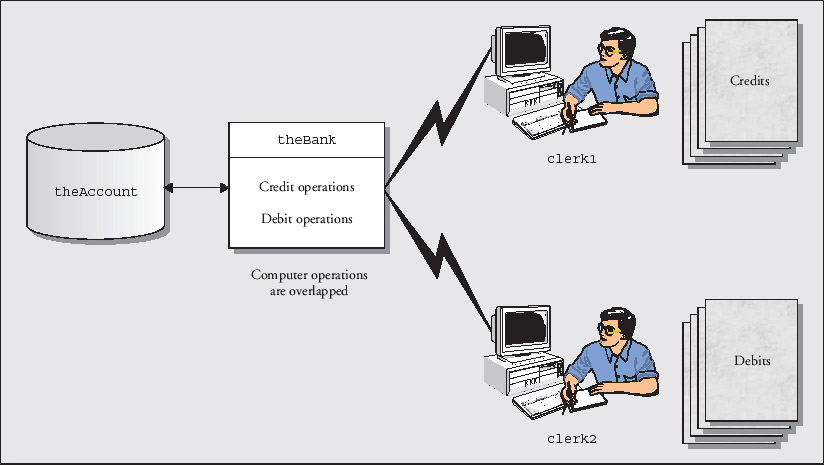 Of course, this is not the only way of getting the operations to overlap. Another approach would be to equip accounts with methods to handle their own credit and debit transactions, and declare these as synchronized methods.