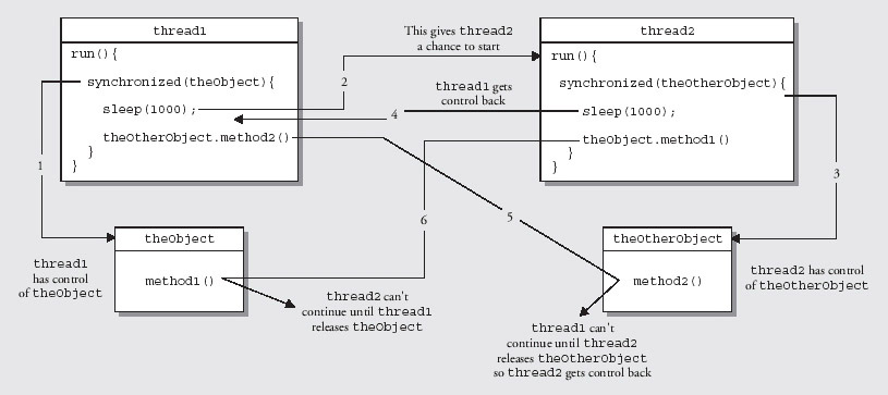 Since you can synchronize code blocks for a particular object virtually anywhere in your program, there's potential for a particularly nasty kind of bug called a deadlock. This involves a mutual interdependence between two threads. One way this arises is when one thread executes some code synchronized on a given object, theObject say, and then needs to execute another method that contains code synchronized on another object, theOtherObject say. Before this occurs though, a second thread executes some code synchronized to theOtherObject, and needs to execute a method containing code synchronized to the first object, theObject. This situation is illustrated here:
