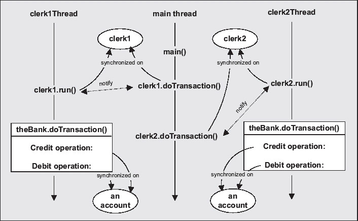 The transaction processing method for the bank can be in both of the clerk threads, whereas the methods that hand over a transaction to a clerk are in the main thread. The diagram also shows which code is synchronized on what objects.