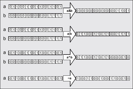 The illustration shows the binary digits that make up the operands and the results. Each of the three binary operations applies to corresponding individual pairs of bits from the operands separately. The complement operator flips the state of each bit in the operand.