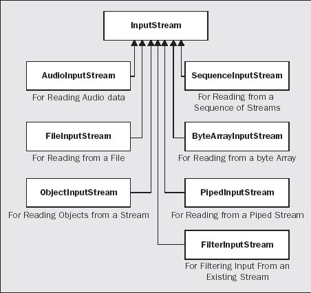 InputStream, and OutputStream are both abstract classes. As you are well aware by now, you cannot create instances of an abstract class – these classes only serve as a base from which to derive classes with more concrete input or output capabilities. However, both of the classes declare methods that define a basic set of operations for the streams they represent, so the fundamental characteristics of how a stream is accessed are set by these classes. Generally, the InputStream and OutputStream classes, and their subclasses, represent byte streams and provide the means of reading and writing binary data.