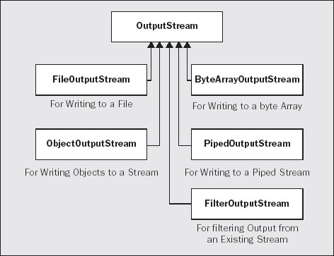 We will be using the FileOutputStream class that is derived from OutputStream when we write files in the next chapter, and will investigate the methods belonging to the ObjectOutputStream class in Chapter 12 Serializing Objects, when we learn how to write objects to a file.