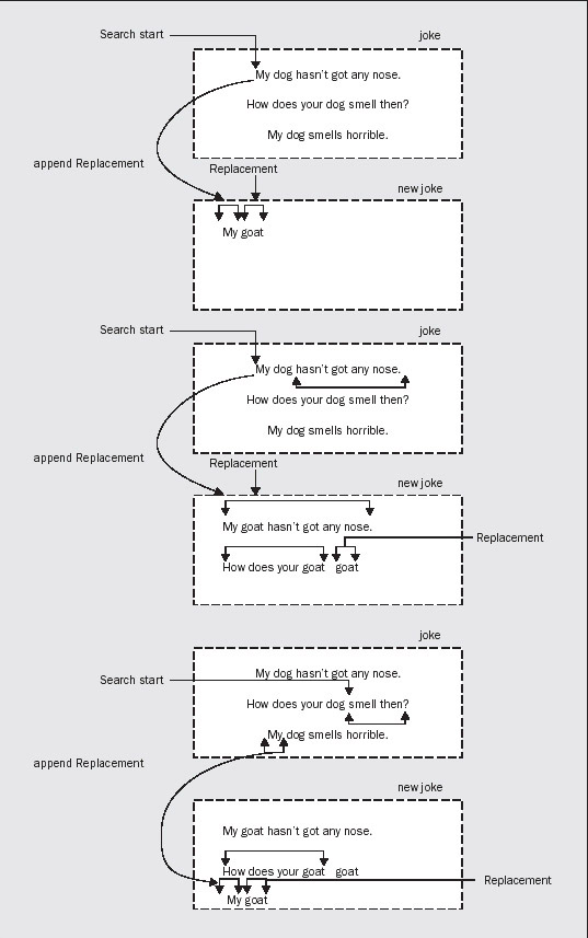 Each call of appendReplacement() copies characters from joke to newJoke starting at the character where the previous find() operation started and ending at the character preceding the first character matched: at m.start()-1 in other words. The method will then append the string specified by the second argument to newJoke. This process is illustrated below.