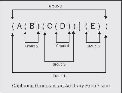 As you see, it is easy to number the capturing groups as long as you can count left parentheses. Group 1 is the same as Group 0 because the whole regular expression is parenthesized. The other capturing groups in sequence are defined by (B), (C(D)), (D), and (E).