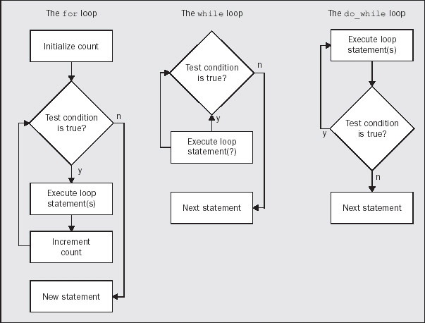 We can contrast the basic logic of the three kinds of loop in a diagram.