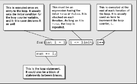 As you see, there are three elements that control the operation of a for loop, and they appear between the parentheses that follow the keyword for. In sequence their purpose is to: