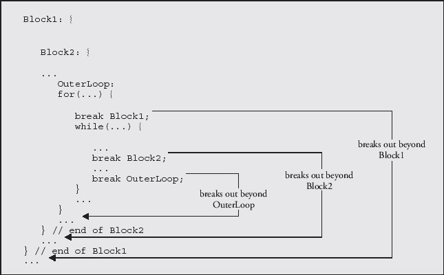 Java also makes a labeled break statement available to you. This enables you to jump immediately to the statement following the end of any enclosing statement block or loop that is identified by the label in the labeled break statement. This mechanism is illustrated in the following diagram: