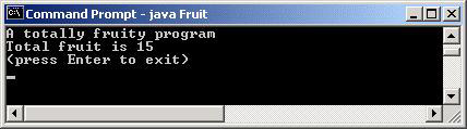 import java.io.IOException; // For code that delays ending the program public class Fruit { public static void main(String[] args) { // Declare and initialize three variables int numOranges = 5; // Count of oranges int numApples = 10; // Count of apples int numFruit = 0; // Count of fruit numFruit = numOranges + numApples; // Calculate the total fruit count // Display the result System.out.println("A totally fruity program"); System.out.println("Total fruit is " + numFruit); // Code to delay ending the program System.out.println("(press Enter to exit)"); try { System.in.read(); // Read some input from the keyboard } catch (IOException e) { // Catch the input exception return; // and just return } } }