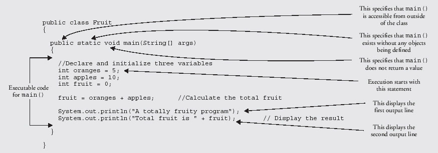 Our program consists of just one class, Fruit, and just one method, main(). Execution of an application always starts at the first executable statement in the method main(). There are no objects of our class Fruit defined, but the method main() can still be executed because we have specified it as static. The method main() is always specified as public and static and with the return type void. We can summarize the effects of these on the method as: