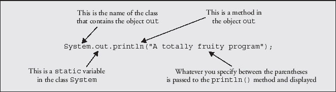 You can see from the annotations above how you execute methods that belong to an object. Here we execute the method println() which belongs to the object out, which, in turn, is a static variable of the class System. Because the object out is static, it will exist even if there are no objects of type System in existence. This is analogous to the use of the keyword static for the method main().