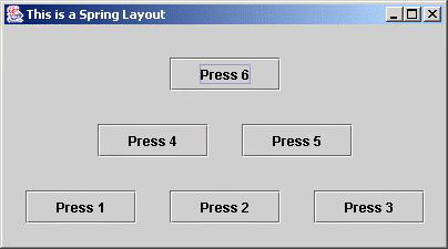 Here's an exercise to tickle the brain cells – use a SpringLayout to obtain the button arrangement shown below in an application window.