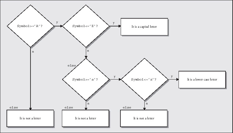 The nested if statement, which is executed if symbol is 'A' or greater, tests whether it is 'Z' or less. If it is, then symbol definitely contains a capital letter and the appropriate message is displayed. If it isn't then it may be a small letter, so another if statement is nested within the else clause of the first nested if, to test for this possibility.