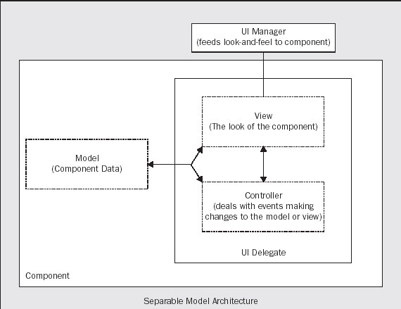 The way the Swing components provide for a pluggable look-and-feel is to make the visual appearance of a component and the interface to the user the responsibility of an independent object called the UI delegate. This is the view+controller part of the MVC model. Thus a different UI delegate can provide a component with a new look-and-feel.
