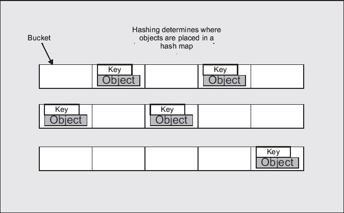 As we saw at the beginning of this chapter, a map is a way of storing data that minimizes the need for searching when you want to retrieve an object. Each object is associated with a key that is used to determine where to store the reference to the object, and both the key and the object are stored in the map. Given a key, you can always go more or less directly to the object that has been stored in the map based on the key. It's important to understand a bit more about how the storage mechanism works for a map, and in particular what the implications of using the default hashing process are. We will explore the use of maps primarily in the context of the HashMap class.