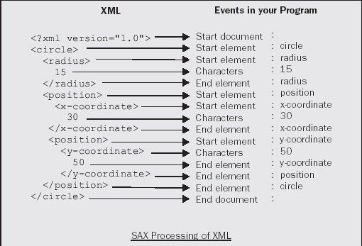 Each type of event results in a different method in your program being called. There are, for instance, different events for registering the beginning and end of a document. You can also see that the start and end of each element result in two further kinds of events, and another type of event occurs for each segment of document data. Thus this particular document will involve five different methods in your program being called – some of them more than once, of course, so there is one method for each type of event.