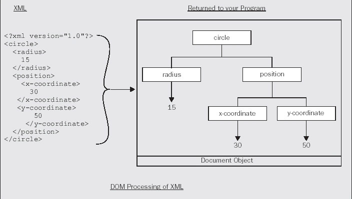 Right at the beginning of this chapter we introduced the notion of an XML processor as a module that is used by an application to read XML documents. An XML processor parses the contents of a document and makes the elements together with their attributes and content available to the application, so it is also referred to as an XML parser. In case you haven't met the term before a parser is just a program module that breaks text in a given language down into its component parts. A natural language processor would have a parser that identifies the grammatical segments in each sentence. A compiler has a parser that identifies variables, constants, operators, etc. in a program statement. An application accesses the content of a document through an API provided by an XML parser and the parser does the job of figuring out what the document consists of.