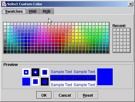 With the JColorChooser class imported, recompile and rerun Sketcher and select the Custom Color... menu item from the general pop-up. You will see the dialog below.