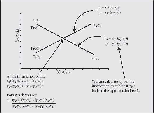 If the lines are parallel, the denominator in the equation for t will be zero, something you should really check for in the code. For the moment, we will ignore it and end up with coordinates that are Infinity if it occurs. |