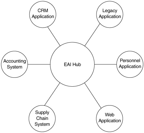 EAI solutions have several drawbacks. They are expensive, and they externalize many business rules outside the application. Typical EAI products have specialized languages to describe the rules for data transformation and routing. The rules for data transformation use data tables and have specific knowledge about the data formats. Some EAI products, if not managed correctly, can house a major part of the business rules for an application. The hub-and-spoke model for communication makes integration and management of an EAI solution easier, but it introduces a single point of failure that leaves many systems vulnerable. The single-point-of-failure problem has been mitigated in EAI products by providing hot backup and clustering features. However, a rule corruption problem, a bad version upgrade, or some other catastrophe could bring down an entire enterprise that relies on the EAI solution.