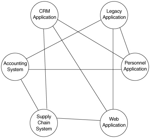 In addition, instead of using EAI solutions for protocol and data format translations, systems communicate directly with each other over Web services, as shown in Figure 1.12. Instead of having a single point of failure using hub-and-spoke topology, Web services form a semi-lattice topology for application communication.