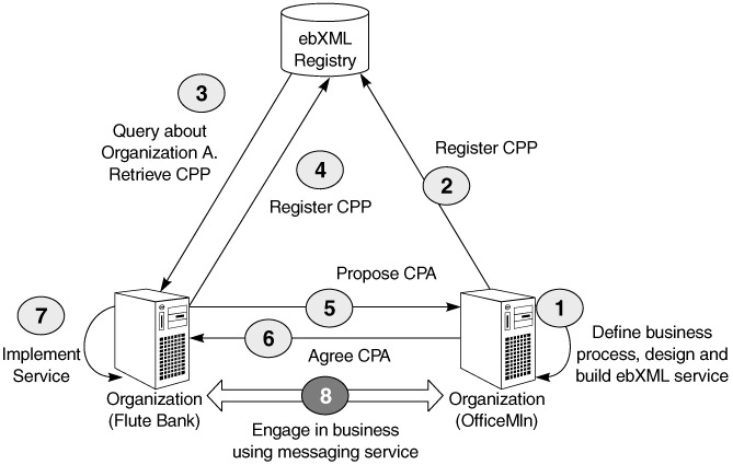 Flute Bank determines that it is able to execute a certain scenario (e.g., place a purchase order) with OfficeMin, but before engaging in that scenario, it submits a Collaboration-Protocol Agreement. This outlines the scenario it wants to use as well as certain transport- and security-related requirements.