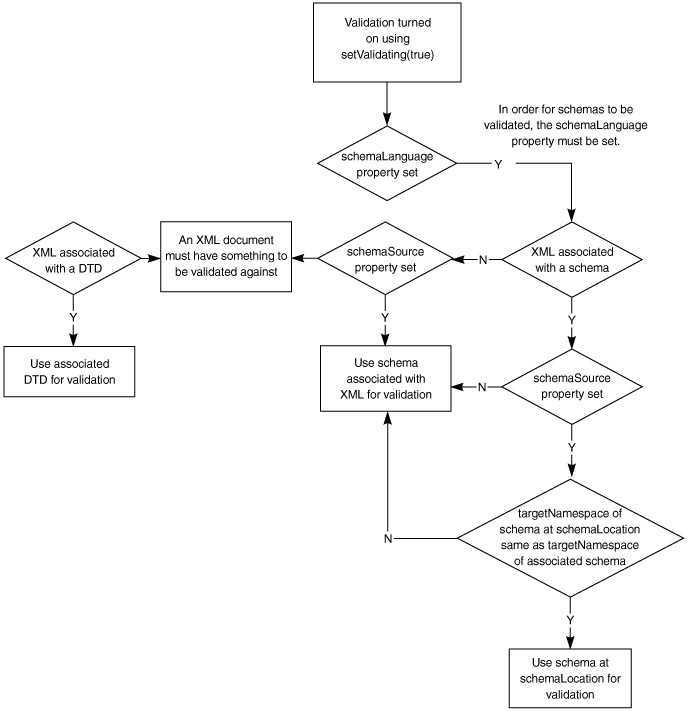 JAXP behavior for parsing and validating schemas with these properties is in line with the W3C recommendation. Figure 9.4 summarizes the flow.
