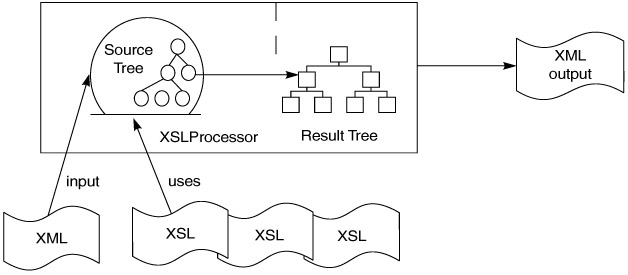 An XSLT processor, analogous to an XML parser, is an application that applies an XSL style sheet (which itself is an XML document and conforms to the XSL schema) to XML data input. Instead of modifying the original XML data, XSLT produces a result—typically HTML or XML and, in some rare cases, binary. Essentially, XSL uses XSLT to transform an XML source tree into an XML result tree, as Figure 9.5 shows.