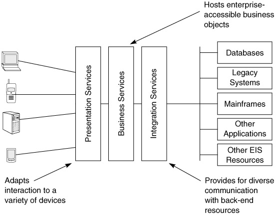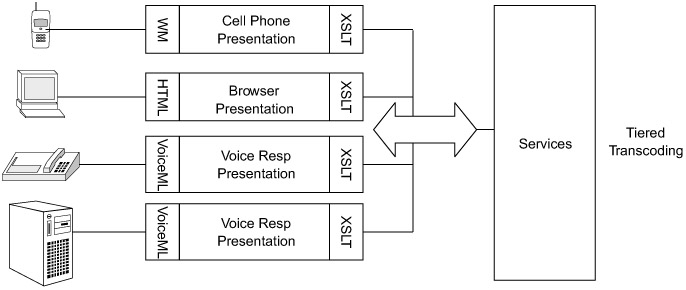 So, why is XSLT important? A typical enterprise application that delivers content to users would use data from multiple EIS resources, apply some business rules and processing to the data, and serve the clients. As Figure 9.7a shows, the clients could be other applications, users, or devices, all using the same logical data. To prevent rewriting the application and the presentation tier for every interface, an XSL-based processor that transcodes same document-centric XML into different formats (XML to WML, HTML, XML, XHTML, etc.) using XSL offers a cleaner content delivery mechanism but the same logical data set. The logical tiering for this approach is shown in Figure 9.7b.