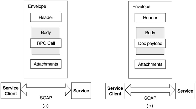 In Chapter 4, we introduced the concept of RPC/document style. Recall that a SOAP message on the wire can be represented in either in RPC style or document style, which affects the body of the message. In RPC style, the client invokes a method on the server, by sending in the body of the SOAP message all information necessary for that method's execution. It receives a response in the same fashion. All SOAP messages shown till now in this chapter have been in RPC style.