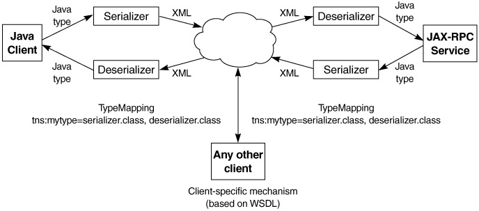 Most vendors will provide several built-in serializers and deserializers, to help developers as utility classes for their runtimes. The code will never be aware of the need for a serializer/deserializer for that particular custom data type, as long the code is deployed in that vendor's runtime. (If you move it to another, you may need to write the serializer and deserializer yourself.) For example, JAX-RPC 1.0 RI supports a subset of Java collection classes and provides corresponding serializers and deserializers as utilities for developers (Table 10.11).