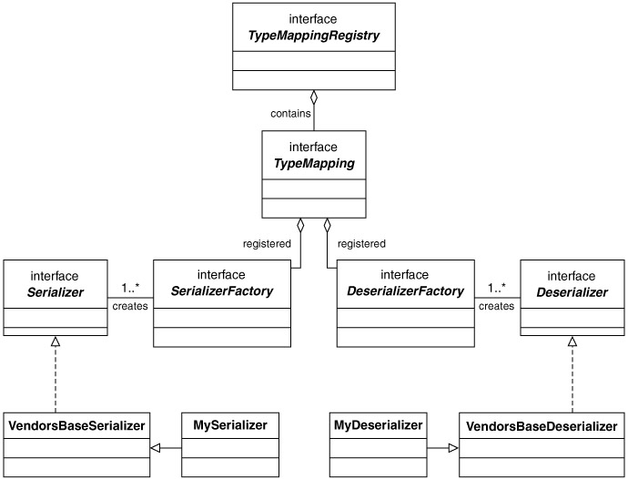 The base serializer and deserializer interfaces are implemented by a runtime-specific class or extended by a runtime-specific interface. Developers use this to write their serializers and deserializers for that particular runtime. However, a larger issue is at hand. A closer look at the Serializer, DeSerializer, SerializationContext, and DeSerializationContext interfaces reveals no methods relate to serialization or deserialization and that these are just marker interfaces. What this means is that serializers and deserializers are not guaranteed to be portable across implementations, because there is no contract with the runtime. They are specific to and pluggable only in a particular implementation. For example, if a developer writes a serializer and deserializer for the JAX-RPC RI, these classes are not guaranteed to be usable in another vendor's JAX-RPC implementation.
