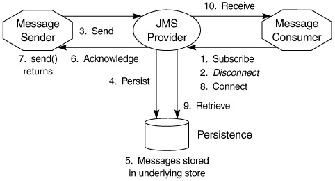 Architecturally, the JMS stack revolves around the concept of providers. This provides the underlying queuing and guaranteed delivery, ensuring that "offline" applications get the messages later, when they are capable of receiving them. Figure 11.7 shows how message delivery and acknowledgment works for a durable message consumer and how the provider acts as a proxy that actually receives messages on behalf of the eventual recipients.