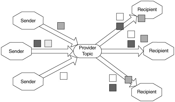 Publish-subscribe. In this model, the sender sends the message, which is put on a topic. Multiple recipients can subscribe to the topic; each receives a copy of the message (Figure 11.8b).