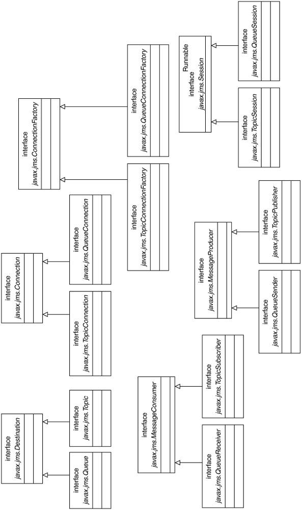 The JMS implementations of point-to-point and publish-subscribe paradigms use the same fundamental concepts but have specialized classes to handle them. In simple terms, there is a common set of base interfaces. Each base interface has at least two sub-interfaces: one for the point-to-point model, and the other for the publish-subscribe model. Figure 11.9 shows the core of the JMS API.
