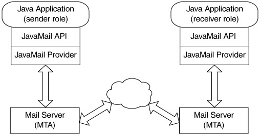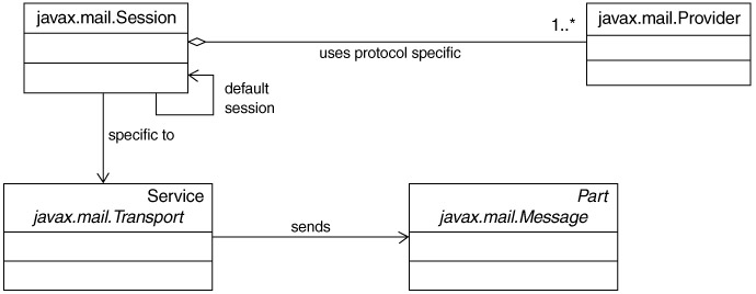 Figure 11.14 illustrates the concept behind sending mail messages using the JavaMail API. A Session is created to a server, using an underlying Provider. Message objects are created and sent using the Transport for that provider session. The semantics of how a provider establishes a session and the physical connection are completely abstracted from the application code.