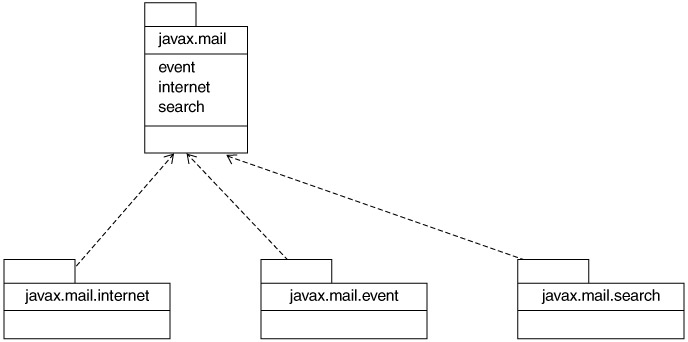 The JavaMail API, shown in Figure 11.13, consist of three packages that contain both the client API and the API that serves as a contract for providers to implement. These packages also contain the classes and interfaces to model events, notifications, and searching. We will not discuss all these features in detail but will limit our discussion to sending and receiving messages.