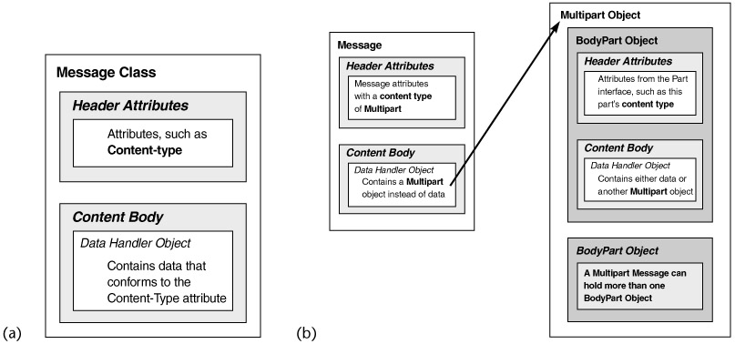 The Message is logically composed of different sections, as Figures 11.15a and 11.15b illustrate. It has some Header attributes (To, From, Subject, etc.) and the content data. Email messages that contain attachments are modeled as Multipart messages. In a Multipart message, the body consists of many BodyPart objects.
