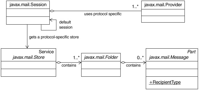 Email applications can be divided into two broad categories: Mail User Agent (MUA) and Mail Transfer Agent (MTA) applications. MUA applications, such as Eudora, Netscape Messenger, and Microsoft Outlook, allow messages to be composed, accessed, and sent. MTA applications, such as iPlanet Messaging server and Microsoft Exchange, handle the actual physical delivery. JavaMail, shown in Figure 11.12, is a standard extension API focused on building MUA functionality into Java applications. Like JMS, it is designed with provider-based architecture, for wire protocol independence. Several MTAs are freely available, including "JAMES" from Apache, which uses POP3/SMTP protocols. It can be found at http://jakarta.apache.org/james/index.html and is included in the CD for this book.